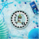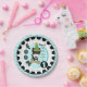 Little Dog Lover 1st Birthday paper plates, great for kids turning one year old who love puppies and dogs! Features a cute black and white dog in a green and yellow polka dotted party hat, big dog bone, text that reds WOOF The Little Dog Lover is 1, and has a decorative black ring and border edge of aqua, light blue, and white chevron stripes! You can easily add the birthday child's name to these 1st puppy dog paper plates a well as a thank you message to the guests! We have the matching T-shirts, bibs, bags, and more!