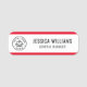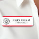 This customisable red name tag is a professional and versatile choice for any workplace. It features a clear layout with space for your name, title, and company logo.