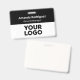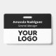 Make your business look professional with custom name badges featuring your company logo, employee name, and job title. Customise it in the sidebar. The staff person's name appears at the top in bold white text with the job title or custom text below it in a white italic font on a black background. The bottom half of the badge features your logo on a white background. Your logo can be rectangular, circular, square, or another shape and any colour.