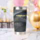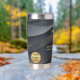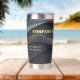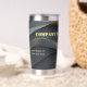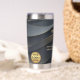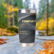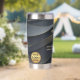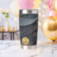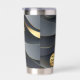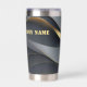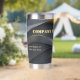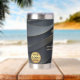Office thermal tumbler featuring your custom logo and texts on a grey gold abstract design. The waving lines add to the feeling of being "in flow", making everything easier.