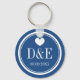 Personalised monogram wedding party favour keychain. Monogrammed keychains with name initials of bride and groom plus date of marriage. Cute heart love symbol and custom background colour ie nautical navy blue and white. Make your own pretty key chain for guests, bride to be, groom, bridesmaids, etc Also nice for classy bridal shower, engagement, save the date or anniversary.