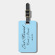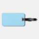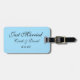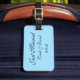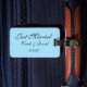 Custom luggage tag is shown in a light blue colour with Just Married text. Customise this tag and change names and date to yours, also put your photo on the back of tag. You can even change colours.