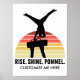 This cool mens gymnastics print features a male gymnast in a handstand on a pommel horse in front of a beautiful sunset. The funny quote reads RISE SHINE POMMEL. Customise this poster with your gym or company name.