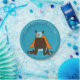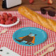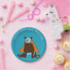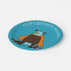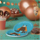 These paper party plates are ready to be personalised with your own message in white lettering. They feature a fun illustration of a brown bear dressed in a luchador costume or Mexican pro wrestler costume with a face mask, cape and shirts in light blue and orange. The plates have a teal blue background.
