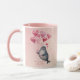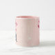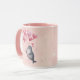 Happy Valentine's Day romantic mug with a personalized message and a cute seal illustration with heart balloons. Pink background design.