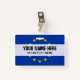 Custom metal clip badge with European Union flag. Plastic tags with metal clip on and lanyard cord option. Customisable text. Add a photo on the back optionally. Useful ID tags for office, volunteer work, events, meeting, gathering, party, festival, sports teams, clubs, political delegation and more. EU flag with yellow stars. Transparent overlay.