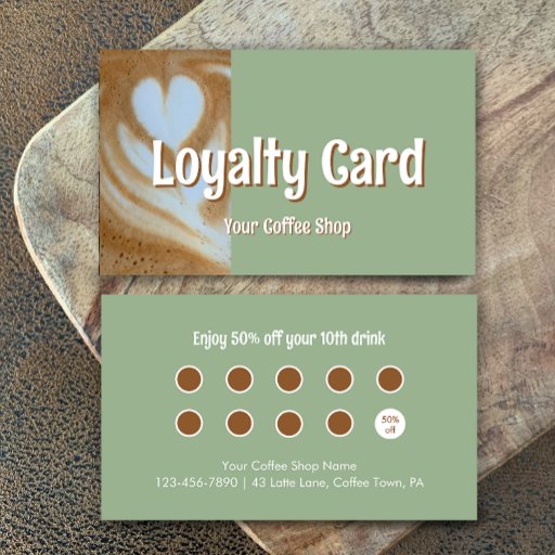 Promote your business with a custom rewards card. Customize this customer loyalty card with your own text. Reward your customers after their 10th purchase. The coffee latte art design is perfect for a cafe, coffee shop, bistro, barista, coffee roaster, restaurant or church cafe. The stylish eucalyptus green is trendy. All the modern text is editable. Personalize your cafe loyalty card with your name and address and custom text as needed.