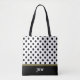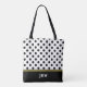 This black-and-white tote bag has a black polka dot pattern. At the bottom of the bag, there is a black band that you can use to customise the bag with your initials/text. The faux gold lines above the monogram are an artistic rendering (no gold foil on bag).