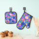 Custom monogram floral blue oven mitts. Blue colourful tropical Oven Mitt & Pot Holder Set with fruits, flowers, pineappels. Personalised kitchen accessorie for women, mothers, wifes, cookers, chiefs. Gift idea for birthdays, mothers day, christmas