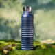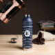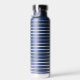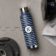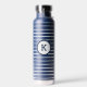 This insulated water bottle is shown in navy blue with white stripes also with a custom monogram letter sample.
