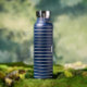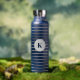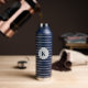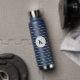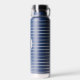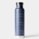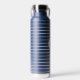This insulated water bottle is shown in navy blue with grey stripes also with a custom monogram letter sample.