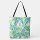 Custom monogram, watercolor tropical palm leaves, tote bag