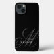 Custom monogram watermark elegant black iPhone 13 Case. Elegant script typography template. Create your own personalised smartphone cover with luxurious design. Fancy swirly lettering that can be enlarged or made smaller and placed to your liking. You can also change all the colours of the letters and background. Beautiful template with luxury style font. Also available for Samsung Galaxy S phones and other popular brands. Protective phone accessories that can be completely customised with your own print.