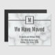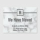 The faux white marble moving announcement has a place to add your monogram at the top. In the middle, you can enter your personalised message. (Shown: We have moved). At the bottom, there's grey text for your name and new address.
