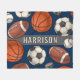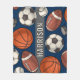 Perfect for athletes of all ages and families for sporting events. Stay warm at chilly football, soccer, hockey and basketball sports games and cuddle up on the couch with this custom monogrammed multi sport patterned fleece blanket. Includes a cool and unique illustrated border pattern of sports balls and hockey pucks along with modern custom all caps outlined text that can be personalised with first or last name. Includes a navy blue background colour.