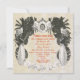 A Moorish theme with palms, sultans and Arabic elements in black on an ivory damask surround the text for an engagement party, bachelor party, Jack & Jill shower or theme party with peacock feather emblem and frame on back.