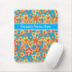 A pretty Mousepad to personalise, with a pattern of ditzy flowers in orange, yellow and red on a turquoise blue background, from a handpainted paper collage by Judy Adamson.