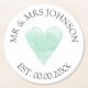 Custom Mr and Mrs mint green watercolor heart painting wedding party coasters. Disposable pulp board coasters for newlyweds, just married couple, bride and groom, husband and wife etc. Personalise with family name / surname and established date of marriage. Rustic country chic design with vintage heart icon and classy typography in a circle. Romantic faded love symbol. Cute drink coasters for beer, wine and other drinks. Elegant design for outdoor weddings, bridal shower, engagement BBQ, anniversary etc. Available in round and square shape. Classy party supplies and accessories for your venue. Grey and minty green / turquoise / aqua colours.
