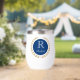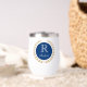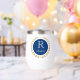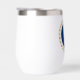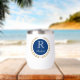 Custom name thermal wine tumbler is shown with a winner's gold wreath print with a sample initial and name.