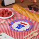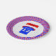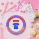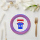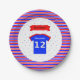 Party plates ready for customisation: just type the birthday boy or girl's name in the box. The text on the banner is also customisable, or you can leave it as "BIRTHDAY". This design is in red and blue on a white background, and features a smart sports tee shirt with the number 12, stripes and stars.