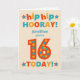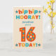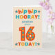 A bright and cheerful birthday card for you to personalize on the front cover, with colourful lettering on a cream background. The front cover greeting is, 'hip hip HOORAY! (Space for you to add the name), you're 16 years old TODAY!' in a bold, colourful script. The red number 16 is extra-large and has big dots in golden yellow and a greenish blue. The inside message is just a suggestion and you can easily change it or delete it if you prefer something different or no printed inside message at all.