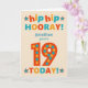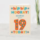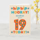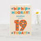 A bright and cheerful birthday card for you to personalize on the front cover, with colourful lettering on a cream background. The front cover greeting is, 'hip hip HOORAY! (Space for you to add the name), you're 19 years old TODAY!' in a bold, colourful script. The red number 19 is extra-large and has big dots in golden yellow and a greenish blue. The inside message is just a suggestion and you can easily change it or delete it if you prefer something different or no printed inside message at all.