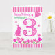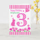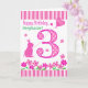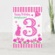 A very pretty 3rd birthday card for you to personalize, with a pink rabbit holding a heart-shaped balloon, a big, pink number 3, filled with a polka dot pattern. There is a pink and white striped pattern at the top and bottom and at the bottom there are pink flowers. The front cover greeting, in pink on white, is, 'Happy Birthday' with space below it for you to add the name of the 3-year old. Also, on the balloon, it says 'TODAY' in white lettering on the pink background and there is a scattering of tiny pink flowers around the number 3. The inside message is just a suggestion and you can easily personalize that too, if you wish.