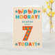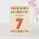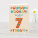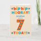 A bright and cheerful birthday card for you to personalize on the front cover, with colourful lettering on a cream background. The front cover greeting is, 'hip hip HOORAY! (Space for you to add the name), you're 7 years old TODAY!' in a bold, colourful script. The red number 7 is extra-large and has big dots in golden yellow and a greenish blue. The inside message is just a suggestion and you can easily change it or delete it if you prefer something different or no printed inside message at all.
