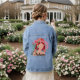 This design features abstract women face with flowers in pink,peach,red and orange colour with botanical leaves.A perfect denim jacket gift for her.