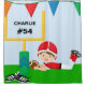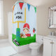 Boys football theme shower curtain for the boy who loves and plays football, features a boy football player in a red uniform and helmet, goal post, flags, and an area you can personalise with his name and number!