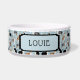 Cute Australian Shepherds / Aussie dog bowl in black, brown and merle coats sit and stand scattered dog bones and paw prints on a light blue background your own custom pet name.