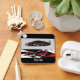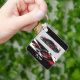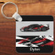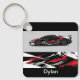 This keychain is shown in a black colour with a auto race car print design with a custom sample name.