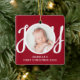 This cute Baby's First Christmas Photo Ornament is decorated with the word JOY in stylish script typography on a red background.