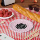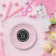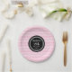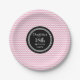 Customisable name and birthday year party plates in fun and chic baby pink, black and white retro chevron zigzag stripes pattern.