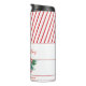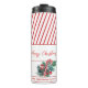 Merry Christmas thermal tumbler in modern calligraphy with candy cane & winter greenery and red striped background.