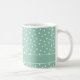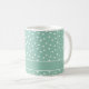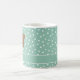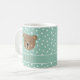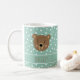 An adorable bear illustration takes centre stage on a background of teal green and white polka dots. Easy to personalise with a name.