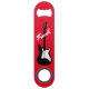 Custom name electric rock guitar bottle opener bar key. Cool Birthday or Christmas Holiday gift idea for guitar player, guitarist, singer, band, music teacher, musician, friends, family. Personalised presents for dad, brother, uncle, husband, grandpa, boss, best friend etc. Double sided print with name and logo. Red or custom colour.