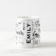 A custom name typography mug of the first name Emily in a variety of type styles that overlaps the initial in the background. Simple colours of contrasting black, white and grey. The name says it all. No one can take your coffee by accident.