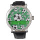 Modern and trendy Custom name sports random black and white soccer balls pattern green background and with green stripe personalised with just add your name gifts or monogram gifts or your initials for a unique gift. Sports gift ideas for men and boys and girls. Ideal for birthdays.