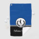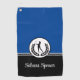 This golf towel is shown as is in a two-tone colour of black and royal blue with a white accent stripe and shows an art print of a golfer.