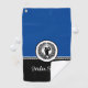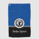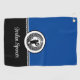 This golf towel is shown as is in a two-tone colour of black and royal blue with a white accent stripe and shows an art print of a golfer.