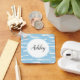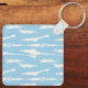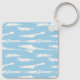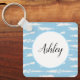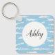 This keychain is shown in a blue and white paint brush strokes print design with a sample name.
