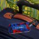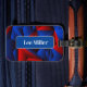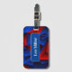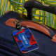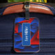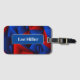 Custom name luggage tag is shown in a blue and red tone's abstract art print and a sample name shown, customise and change the sample text to yours.