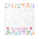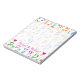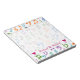 This notepad design features a pattern involving various music notes and music notation symbols coloured a variety of colours. It also features a customised name near the bottom, between heart shapes. [~Z0000006]