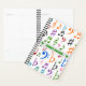 This planner design features a pattern involving various music notes and music notation symbols coloured a variety of colours. The front also features a custom name between two heart shapes in green-coloured text, within a hazy light grey coloured area. A planner like this might make a great personalised gift for a student or a busy professional. [~Z0000214]