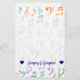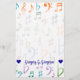 This stationery design features a pattern involving various music notes and music notation symbols coloured a variety of colours. It also features a customised name near the bottom, between two heart shapes. [~Z0000113]