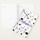 This planner design features a pattern of various sized music notes. It might be appreciated by a musician, a composer, a singer, or somebody else who really likes music. The front also features a customised name between two heart shapes in purple-coloured text, within a hazy light grey coloured area. A planner like this might make a great personalised gift for a student or a busy professional. [~Z0000214]