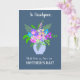 This pretty, contemporary floral Mother's Day greeting card to personalize on the front, features a bouquet of pink, blue and white flowers in a pale blue vase on a dark blue background. There is a space at the top for you to write the name in white handwriting script. Below the vase of flowers, it says, 'With lots of love on ' and then 'MOTHER'S DAY!' in a decorative lettering. The inside message is just a suggestion and you can easily change it or delete it altogether if you prefer a 'blank inside' card.