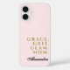 Personalised feminine chic stylish iPhone case with custom name in elegant black script calligraphy handwritten and mum related quote saying phrase in classy gold typo. The mummy attributes are proudly displayed GRACE, GRIT, GLAM, Simple monochromatic premium look minimalist design in pretty girly fashionably candy pastel pink. A beautiful tech electronics accessory to celebrate motherhood and femininity melting. A thoughtful custom gift under 35 dollars for mothers.