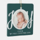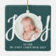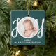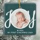 This cute Baby's First Christmas Photo Ornament is decorated with the word JOY in stylish script typography on a green background.